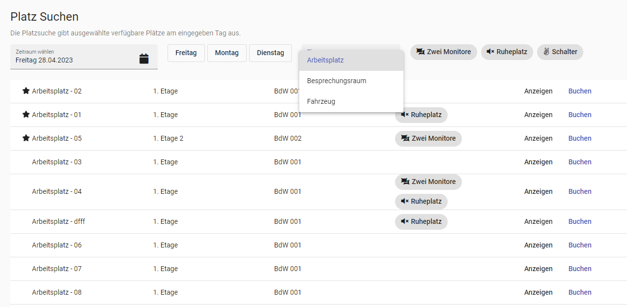 In der oberen Leiste kann man zuerst das Datum auswählen, dann den Typ (Arbeitsplatz, Besprechungsraum oder Fahrzeug) und dann noch die Speziellen Eingenschaften. Nach Auswahl der Suchparameter startet die suche sofort.
