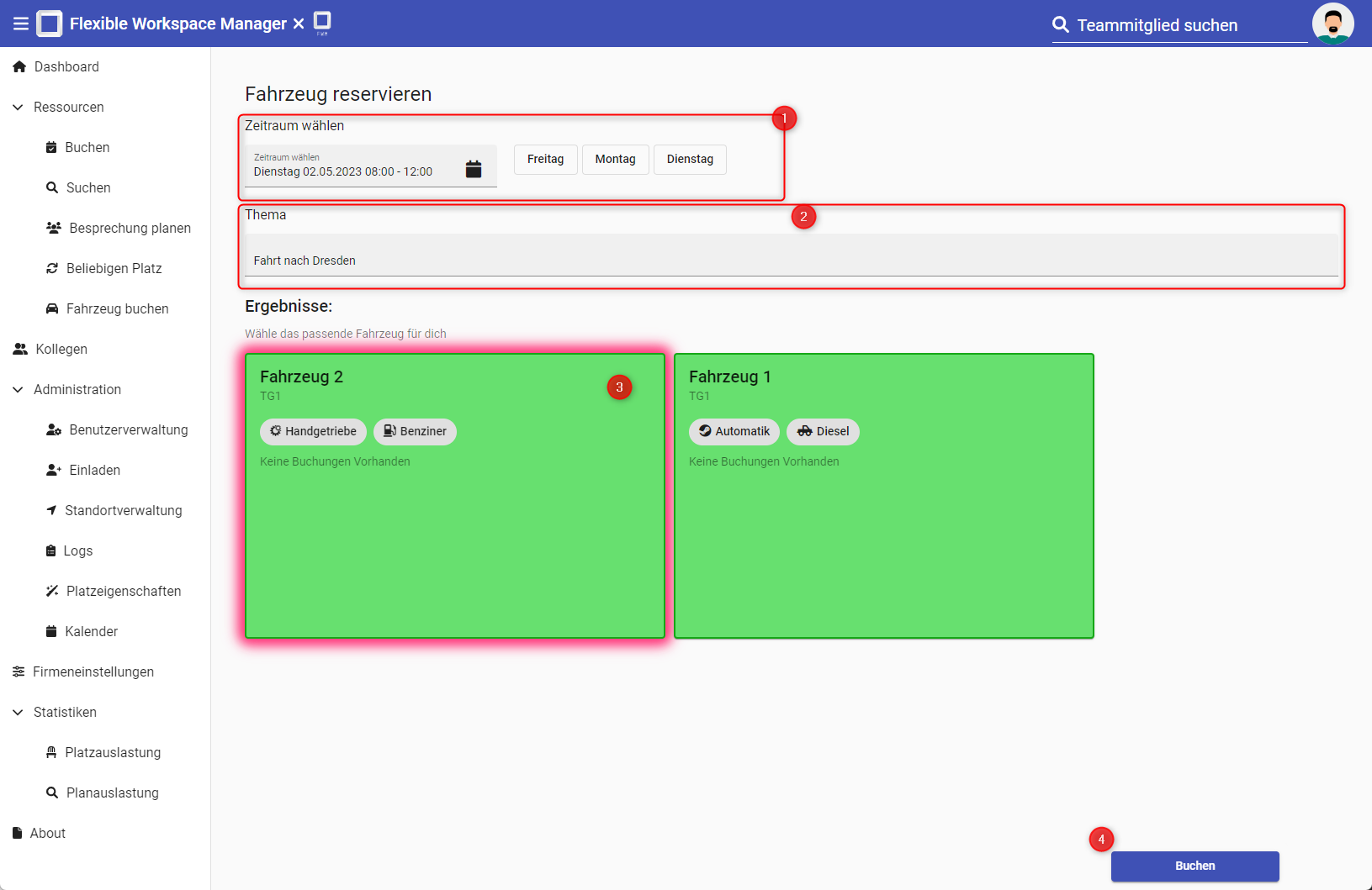 Über das Menü " Fahrzeug buchen" auswählen.