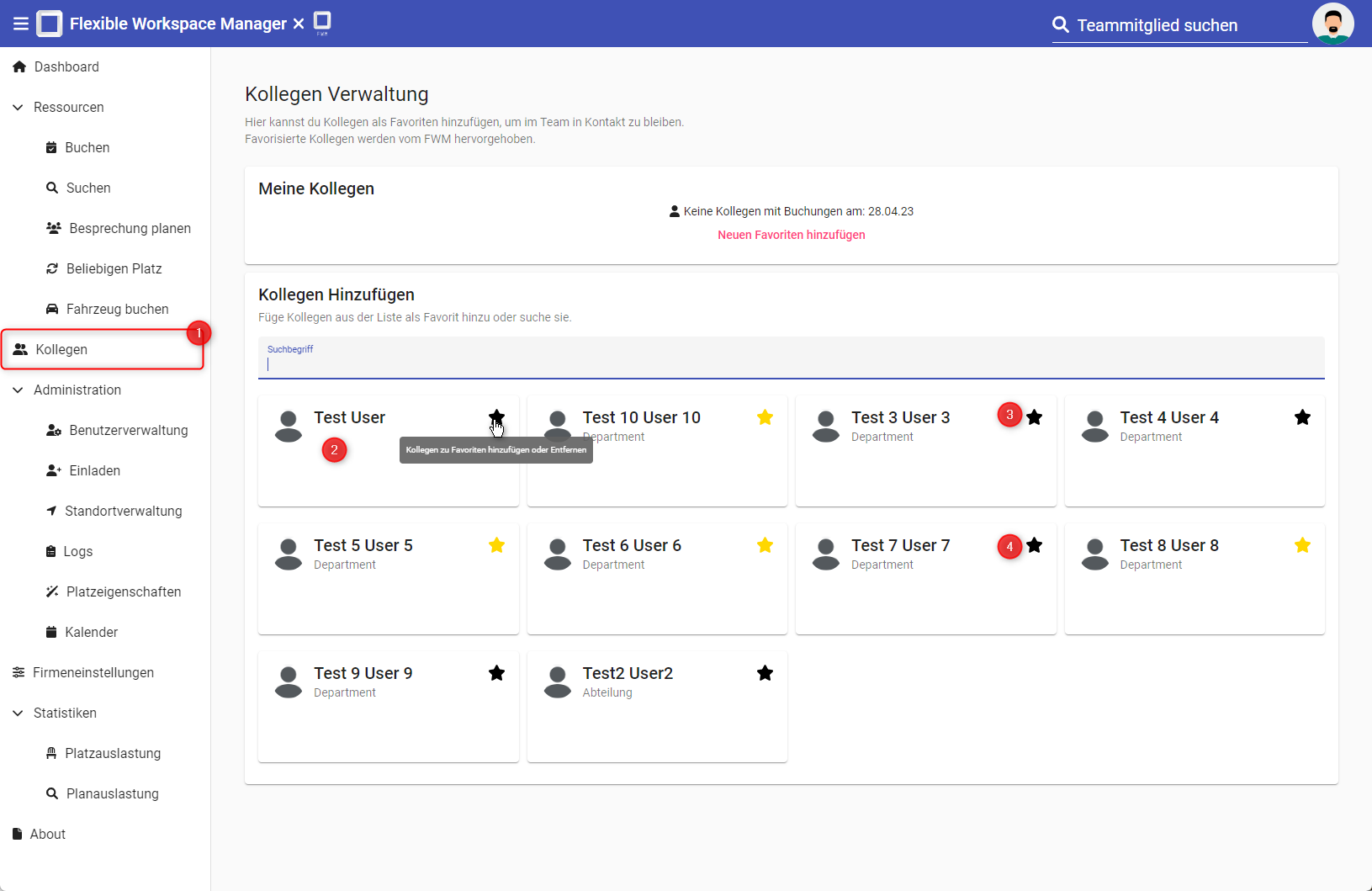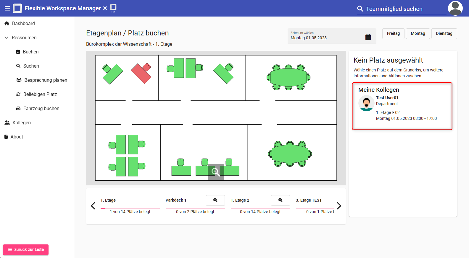 Möchte man einen Platz buchen, so werden die Reservierungsdaten der Kollegen im Bereich "Meine Kollegen" mit angezeigt.