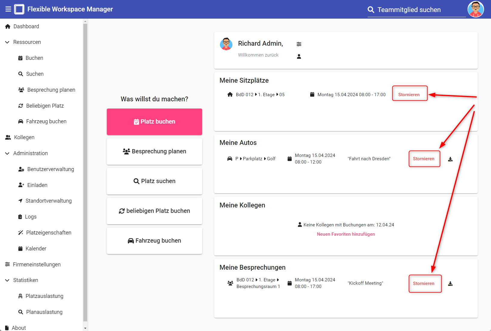 Das Dashboard zeigt die nächsten Buchungen für Arbeitsplätze, Besprechungsräume und Fahrzeuge an. Hinter jeder Buchung befindet sich ein Stornieren-Button.